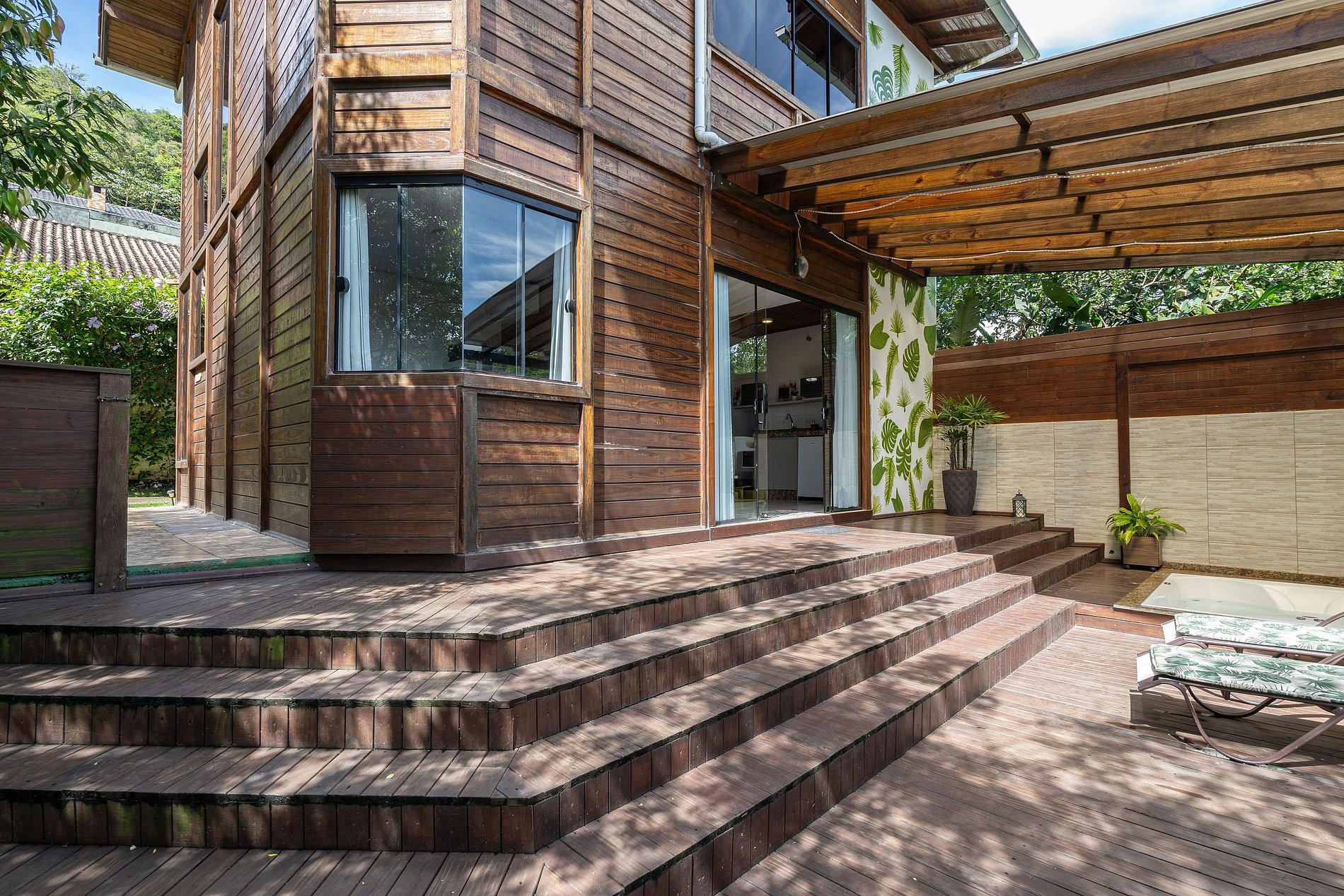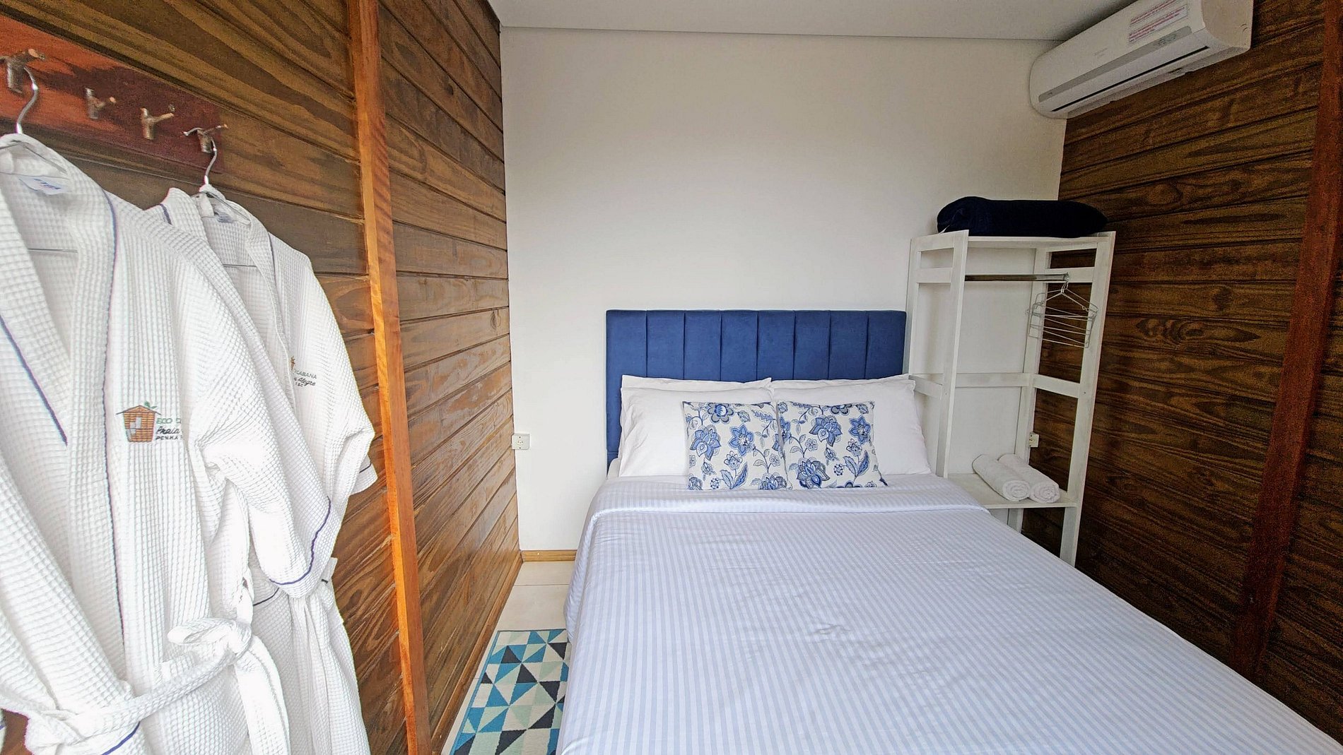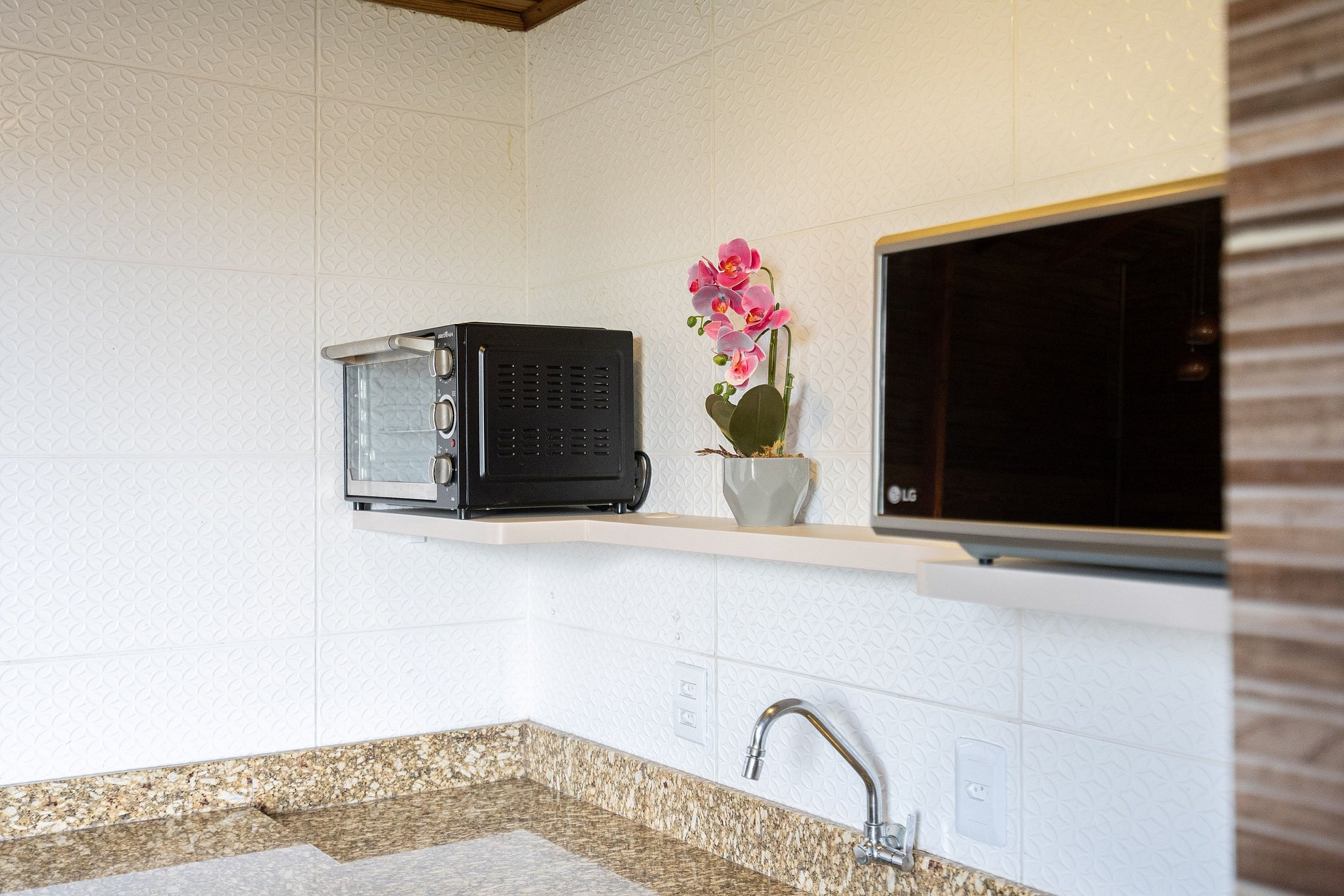 En Praia Alegre, en Penha/SC, la Cabaña tiene capacidad para una pareja con un máximo de dos hijos, ubicada en un espacio propio en la planta baja. Tiene una gran bañera de hidromasaje (spa) cubierta y climatizada en la terraza exterior, con tumbonas y una hamaca. Lugar tranquilo.