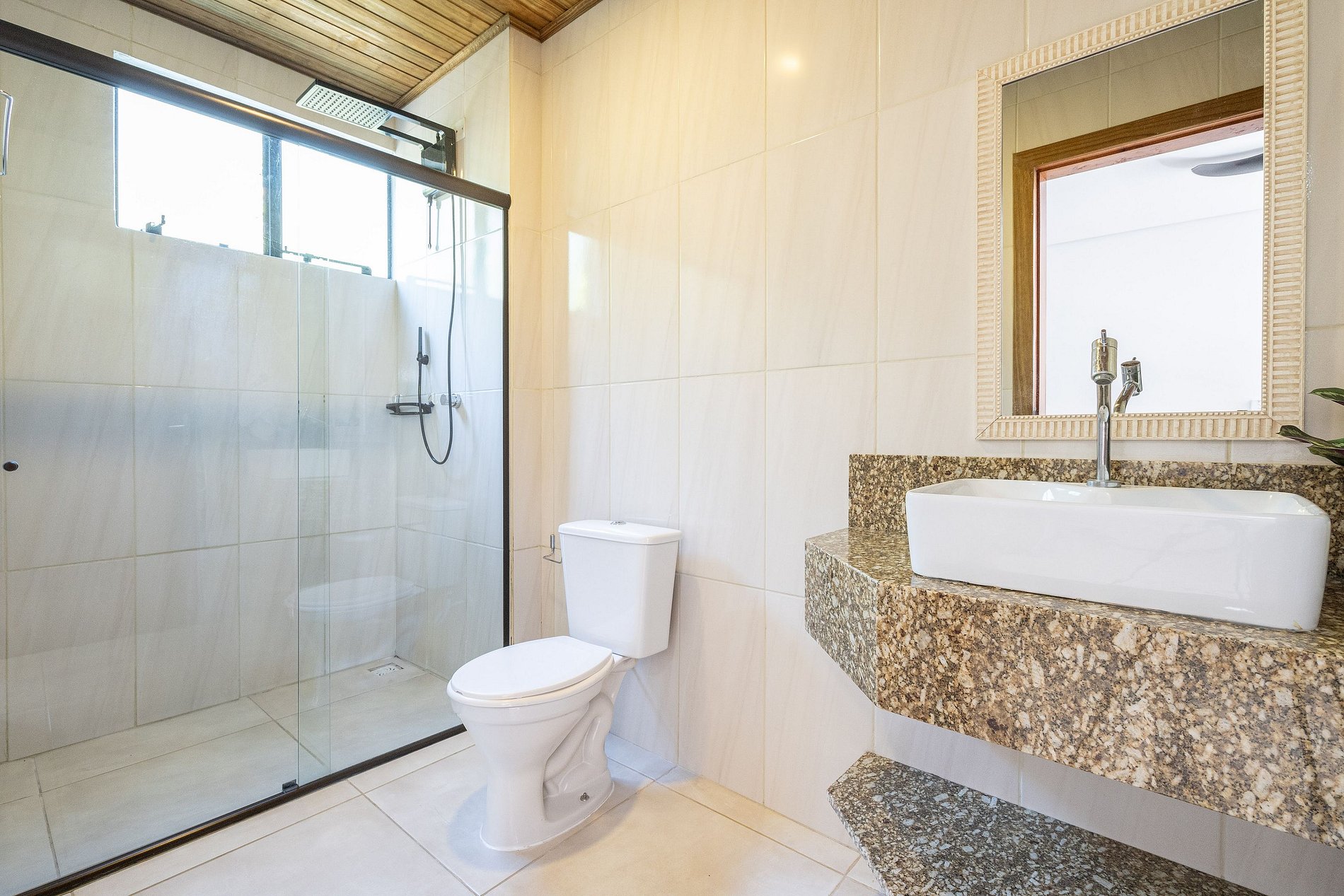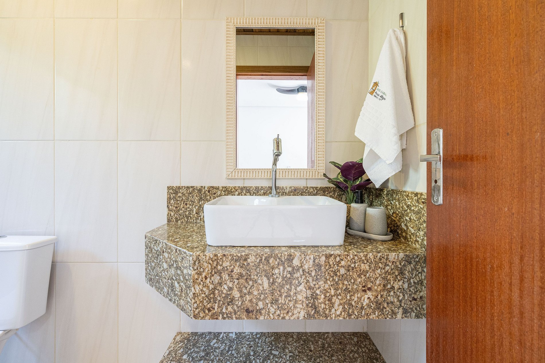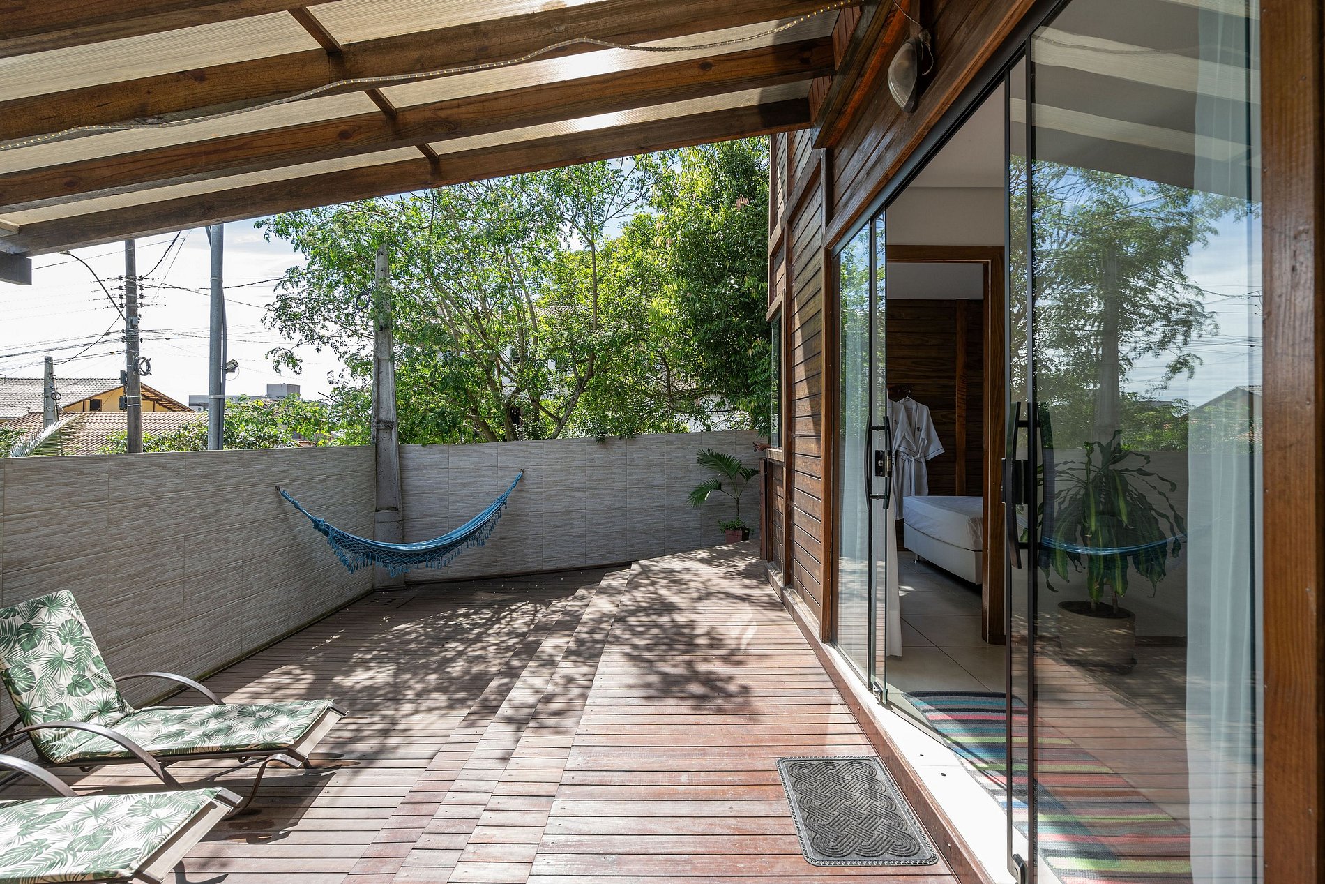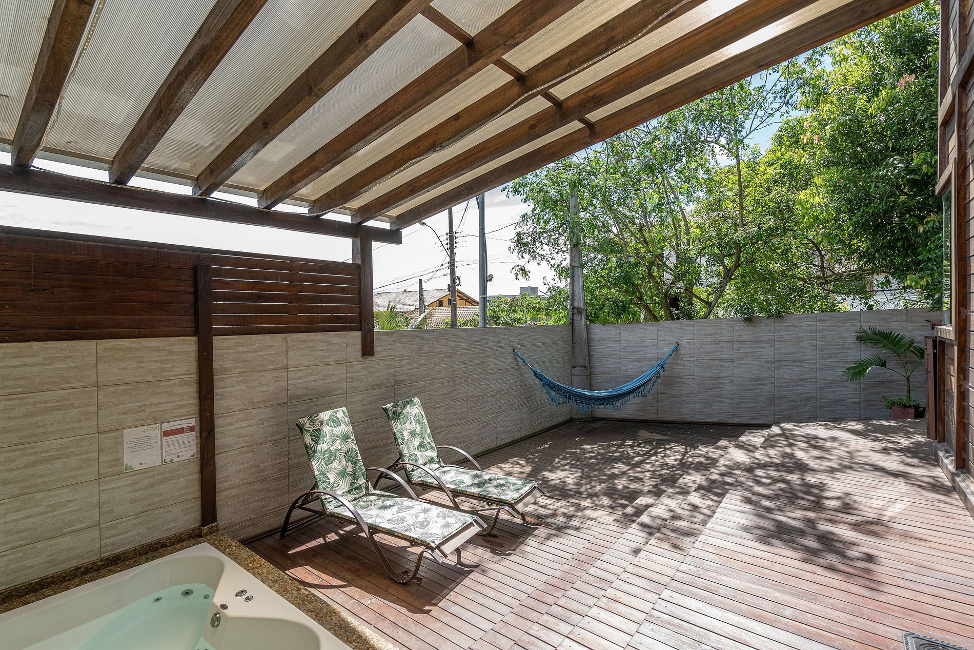 En Praia Alegre, en Penha/SC, la Cabaña tiene capacidad para una pareja con un máximo de dos hijos, ubicada en un espacio propio en la planta baja. Tiene una gran bañera de hidromasaje (spa) cubierta y climatizada en la terraza exterior, con tumbonas y una hamaca. Lugar tranquilo.