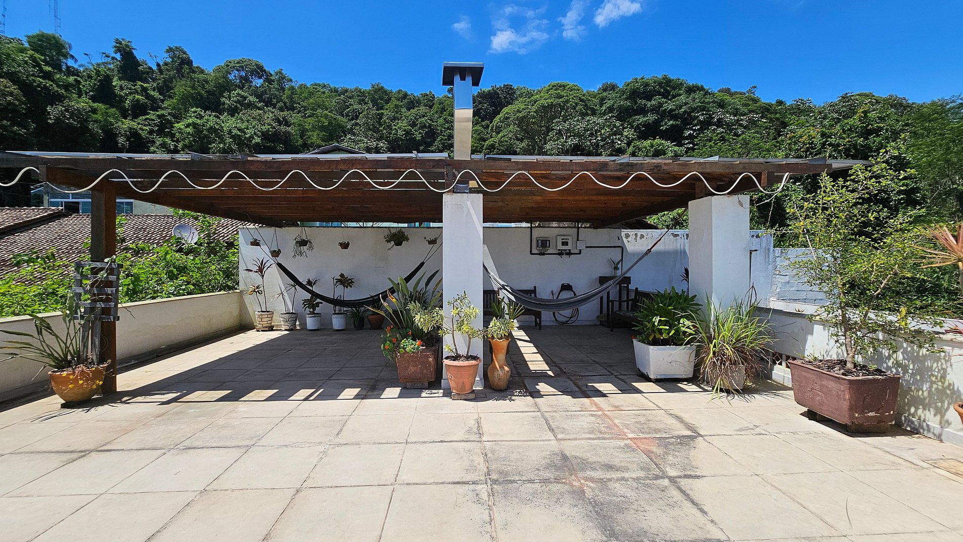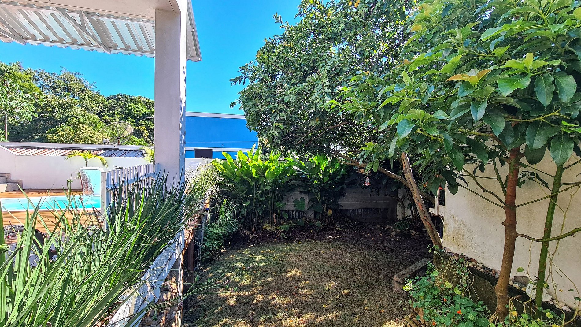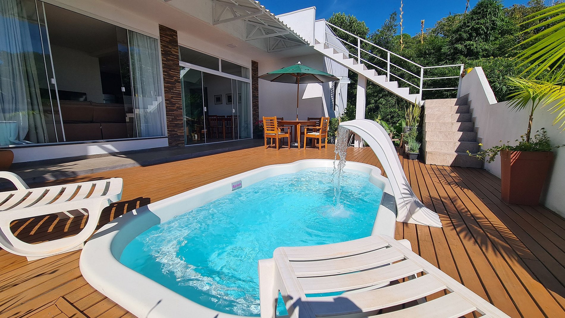 A Casa tem piscina com cascata, deck com espreguiçadeiras, jardim, terraço